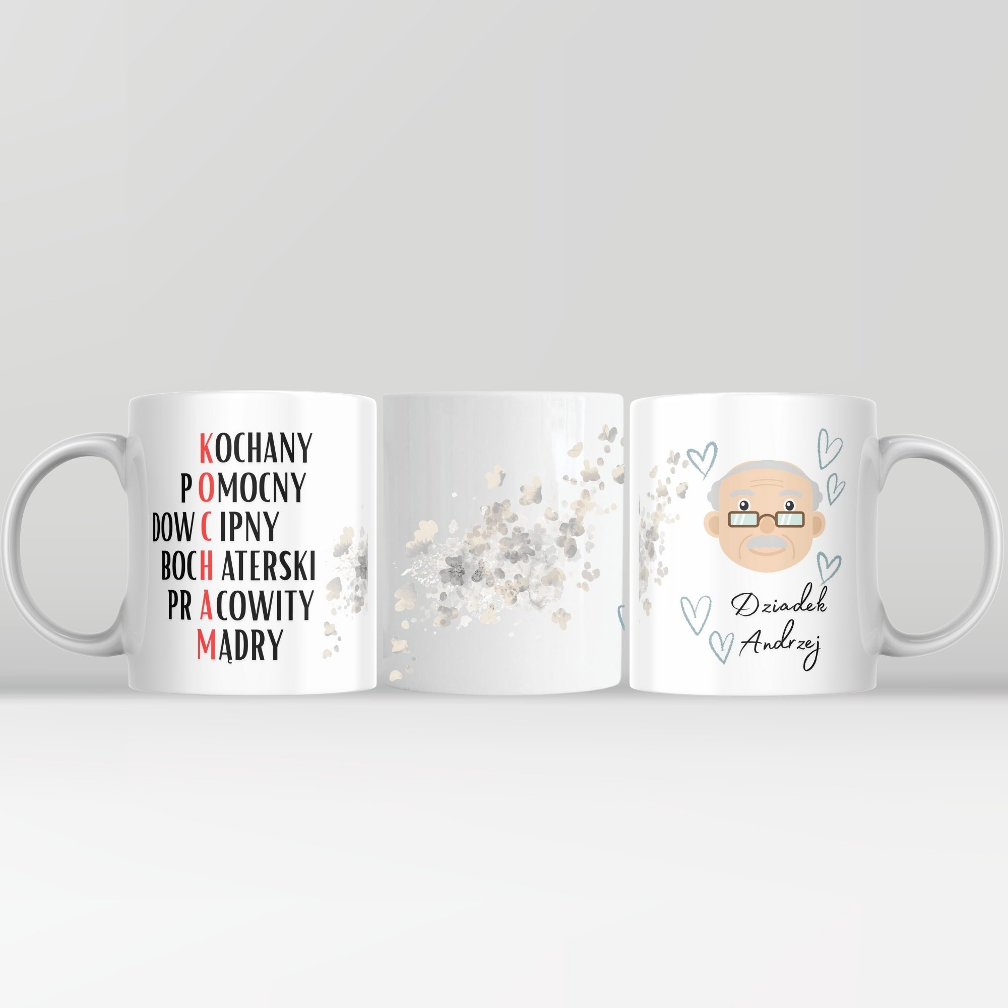 Kubek „Kochany Dziadek” z personalizacją to wyjątkowy prezent. Łączy emocje z codzienną funkcjonalnością. Z jednej strony znajduje się ilustracja uśmiechniętego dziadka wraz z imieniem, a z drugiej opis cech, które najlepiej oddają jego charakter. Takie jak kochany, pomocny, dowcipny, bohaterski, pracowity i mądry.