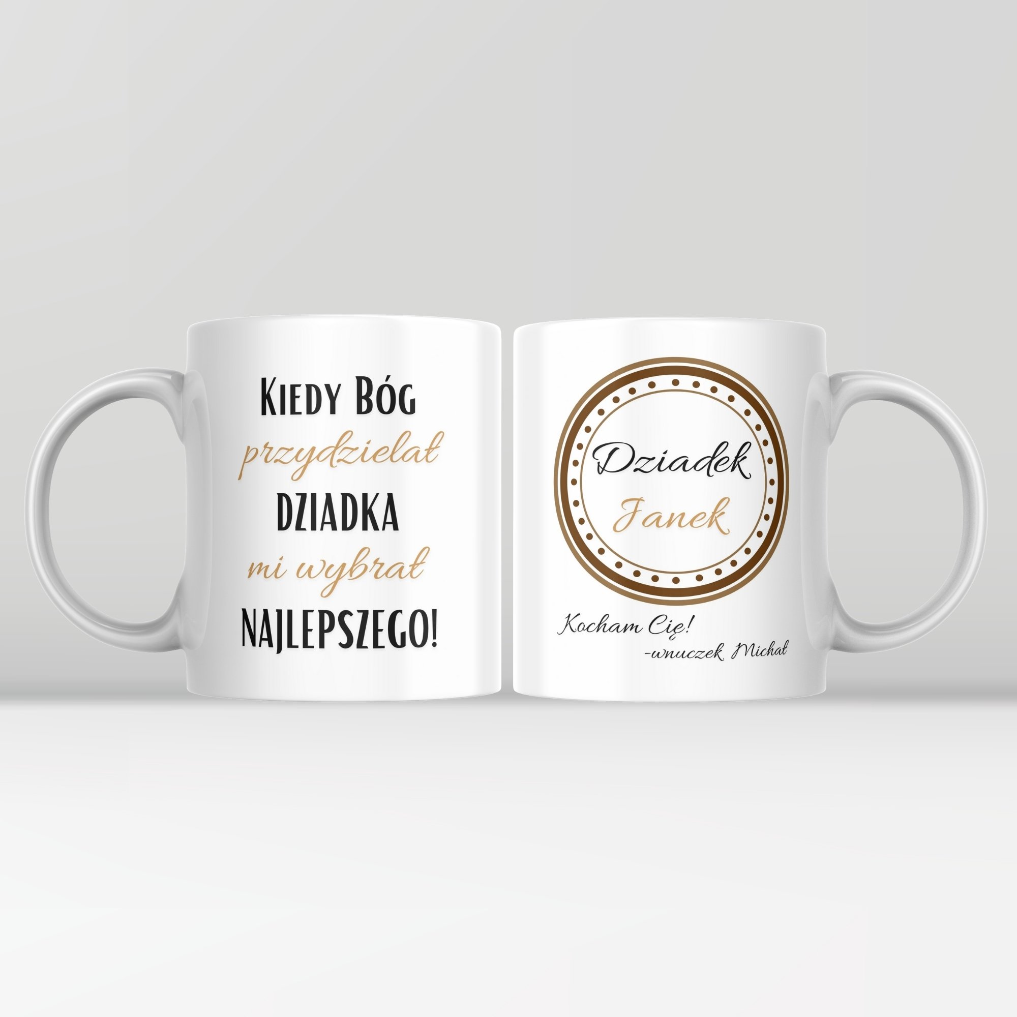 Kubek „Kiedy Bóg przydzielał Dziadka, mi wybrał najlepszego” to wyjątkowy prezent, który w prostych słowach wyraża ogromną miłość i wdzięczność. Klasyczny napis po jednej stronie oraz elegancka personalizacja po drugiej sprawiają, że kubek ma ponadczasowy i bardzo osobisty charakter.