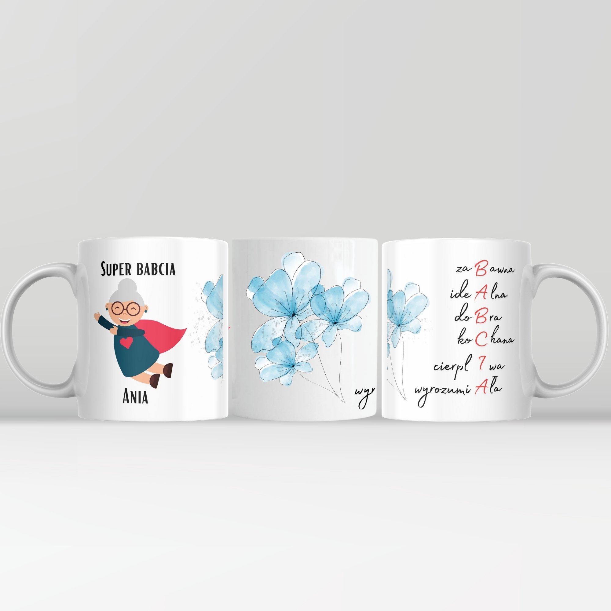 Z jednej strony kubka znajduje się ilustracja „Super Babci” z imieniem. Z drugiej wyjątkowe słowa opisujące babcię jako osobę zabawną, ambitną, dobrą, kochaną, cierpliwą i wyrozumiałą. To połączenie humoru i wzruszenia sprawia, że kubek staje się nie tylko praktycznym przedmiotem, ale także piękną pamiątką na lata.