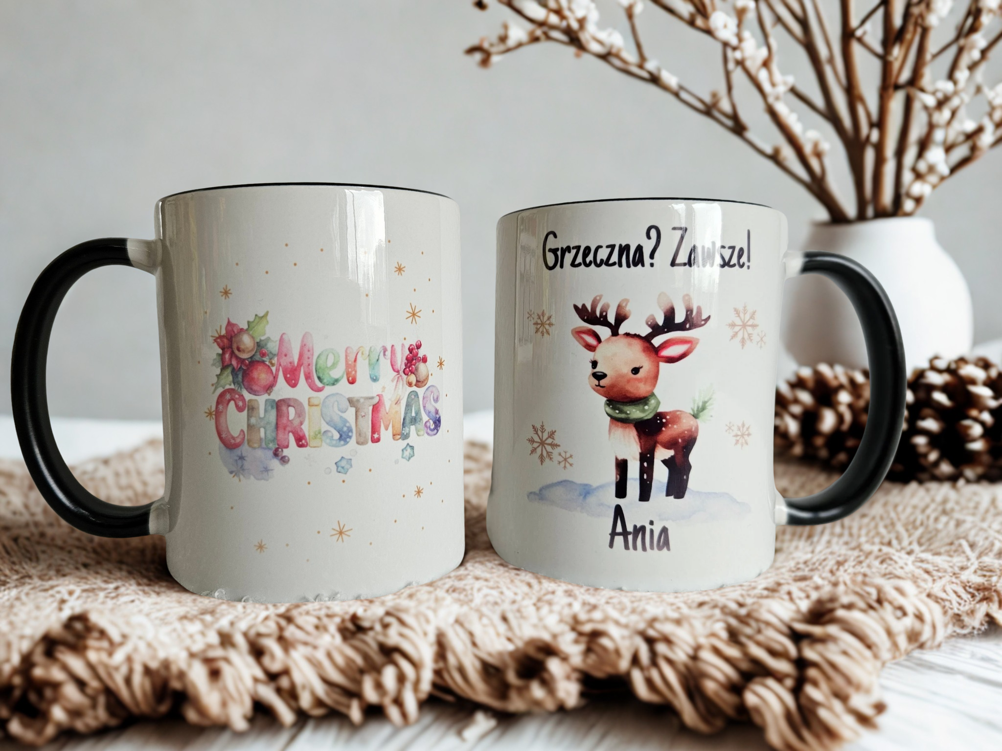 Kubek klasy A+ z kolorowym nadrukiem renifera i humorystycznym napisem „Grzeczna? Zawsze!” to połączenie uroku i świątecznego luzu.