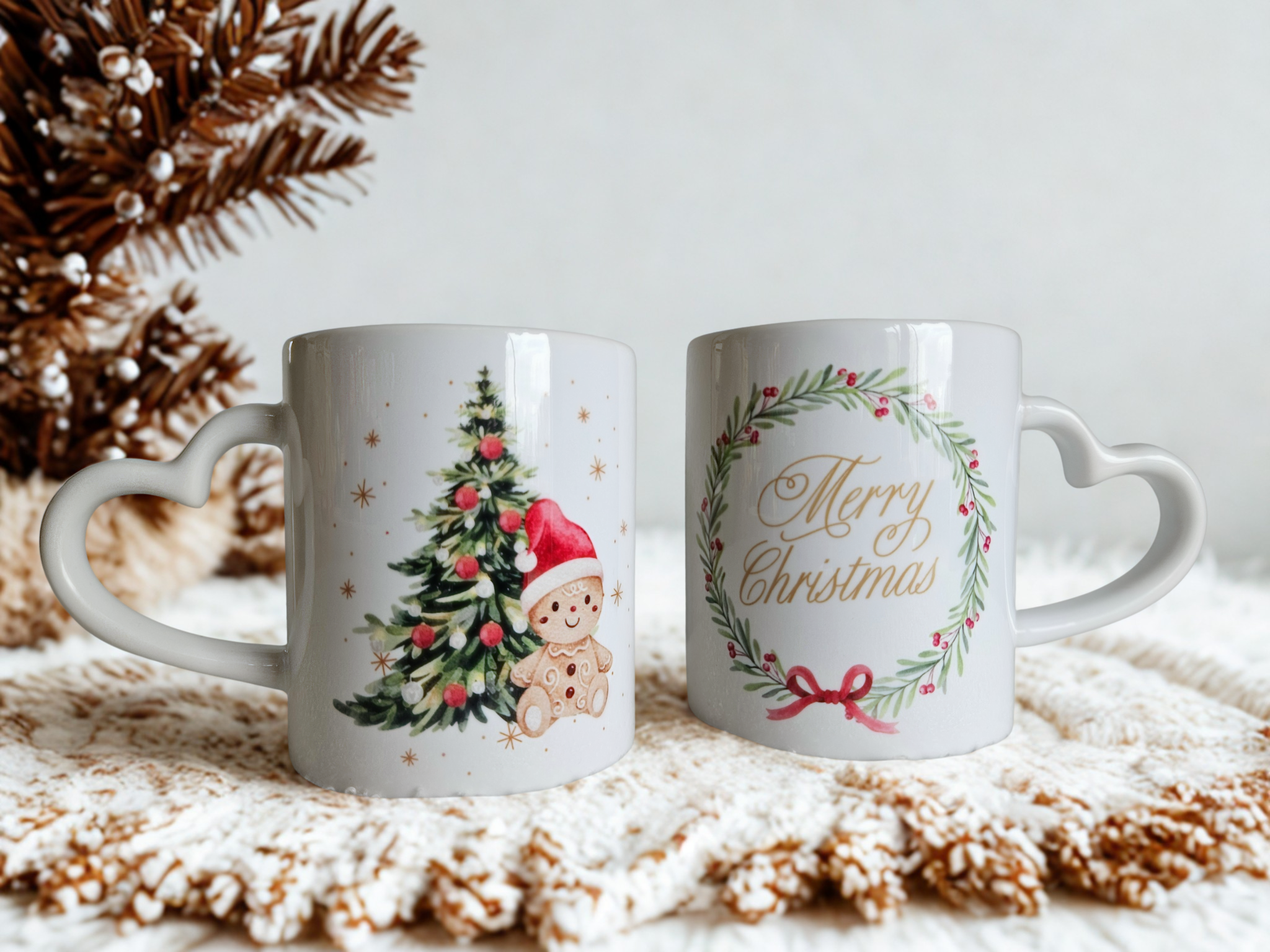 Kubek klasy A+ z romantycznym uchem w kształcie serca oraz grafiką pierniczka i choinki to wyjątkowy upominek świąteczny.