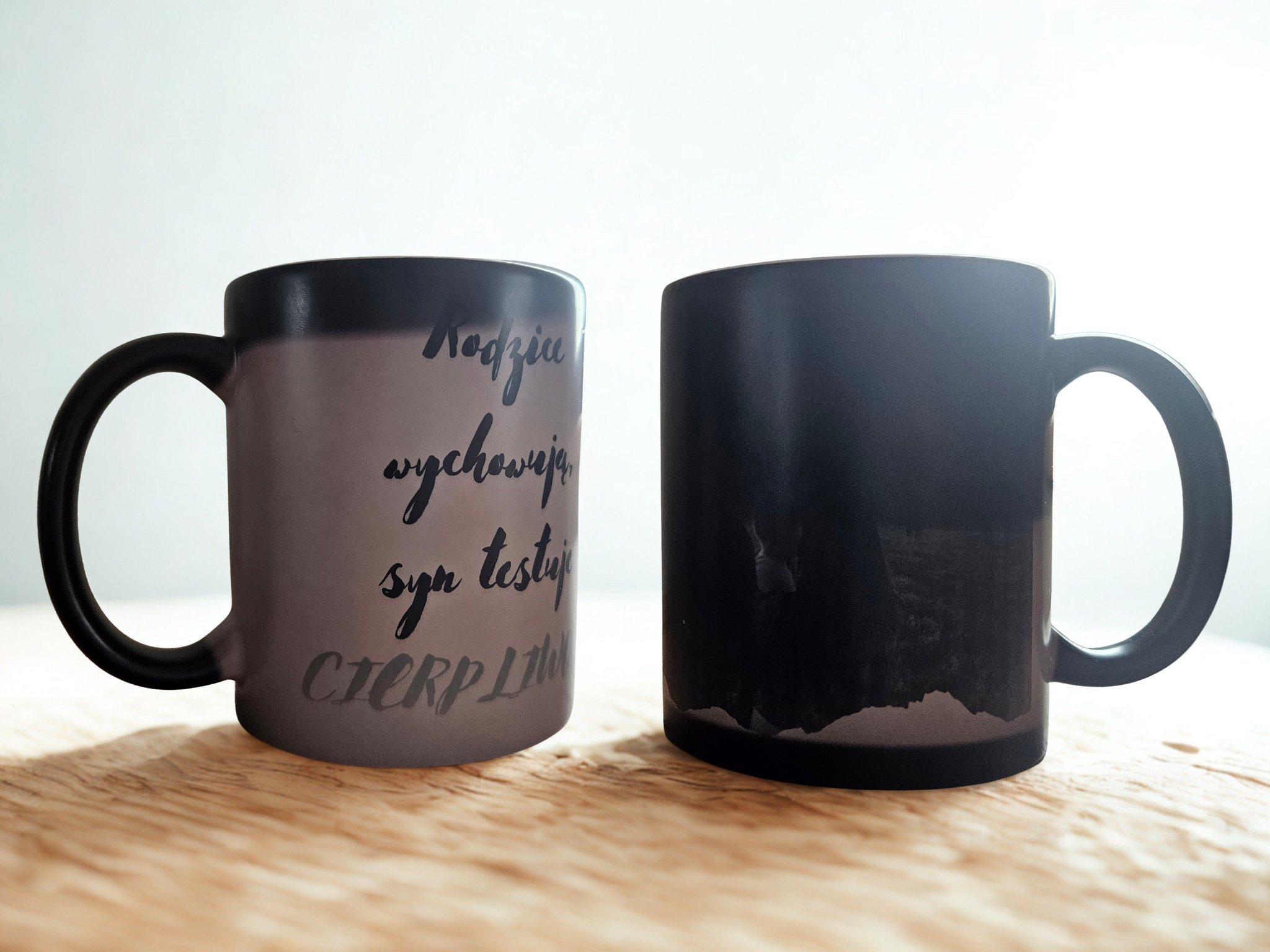 Kubek magiczny czarny półmatowy to produkt, który łączy elegancję z magią. Po zalaniu gorącym napojem odkrywa nadruk, tworząc niepowtarzalny efekt wizualny.