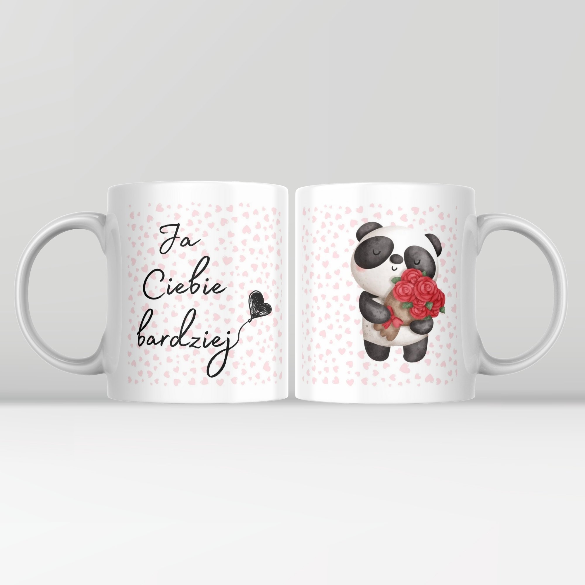 Kubek walentynkowy „Ja Ciebie bardziej” to uroczy i pełen czułości prezent, który w prosty sposób wyraża miłość i bliskość. Delikatny napis po jednej stronie oraz słodka ilustracja pandy trzymającej bukiet kwiatów po drugiej tworzą niezwykle ciepłą, romantyczną kompozycję.