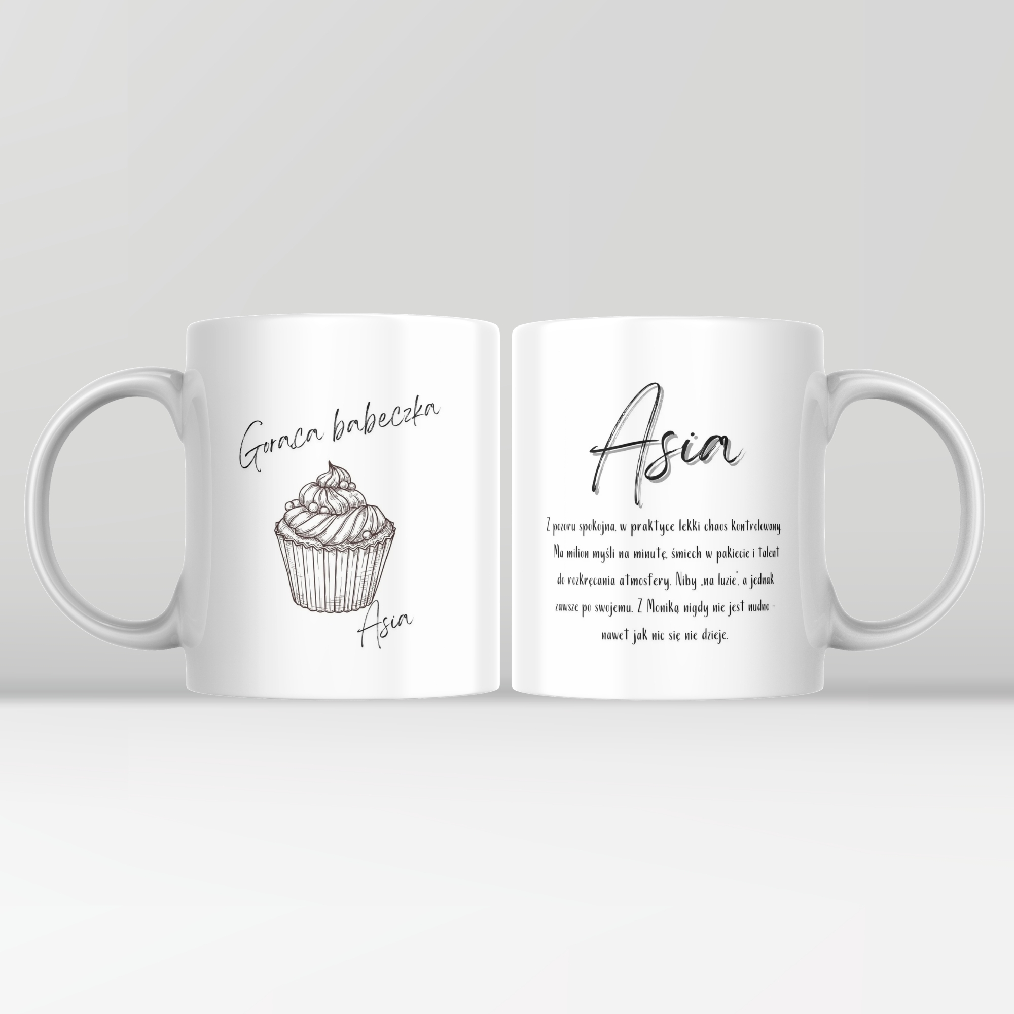 Z jednej strony kubka znajduje się napis „Gorąca babeczka”, subtelna ilustracja muffinki oraz imię. Nadaje to całości lekkości i kobiecego klimatu. Druga strona zawiera imię zapisane elegancką, ręczną typografią oraz krótki opis charakteru – spokojny, z dystansem i nutą humoru. To właśnie ten tekst sprawia, że kubek staje się wyjątkowo osobisty.