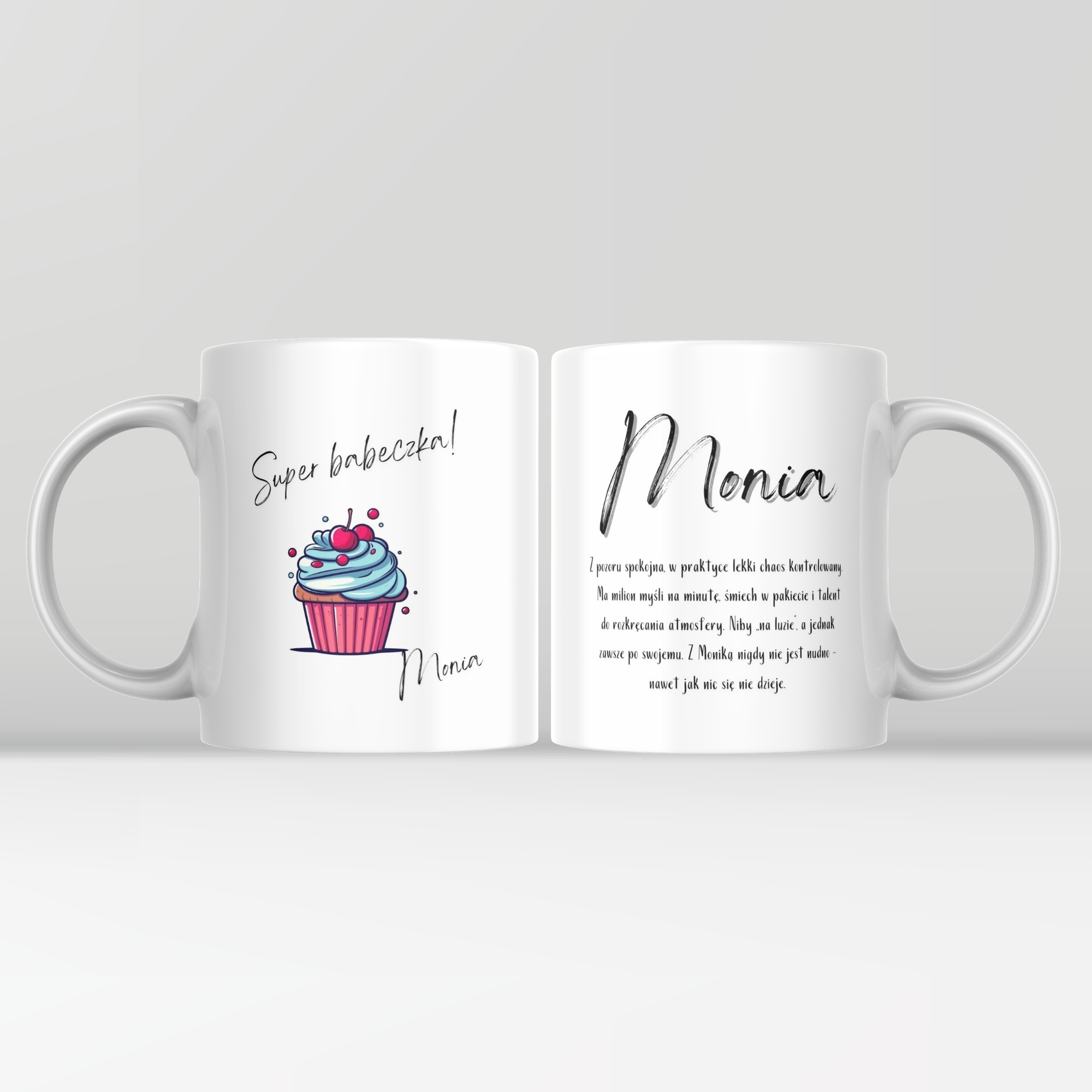 Z jednej strony kubka znajduje się hasło „Super babeczka!” wraz z uroczą ilustracją muffinki oraz imieniem Monia, co nadaje całości lekkości i dziewczęcego uroku. Druga strona to imię zapisane elegancką typografią oraz opis charakteru – subtelny, zabawny i bardzo osobisty. To właśnie ten tekst sprawia, że kubek staje się czymś więcej niż zwykłym gadżetem.