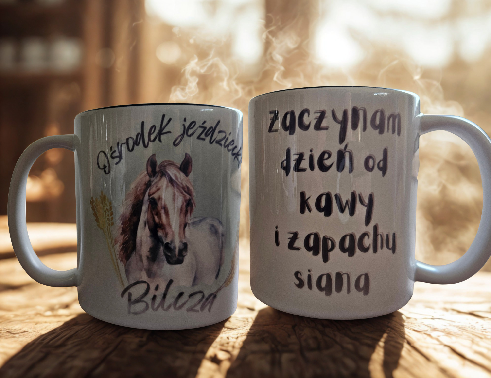 Kubek dla miłośników koni – z grafiką konia i cytatem „Zaczynam dzień od kawy i zapachu siana”.