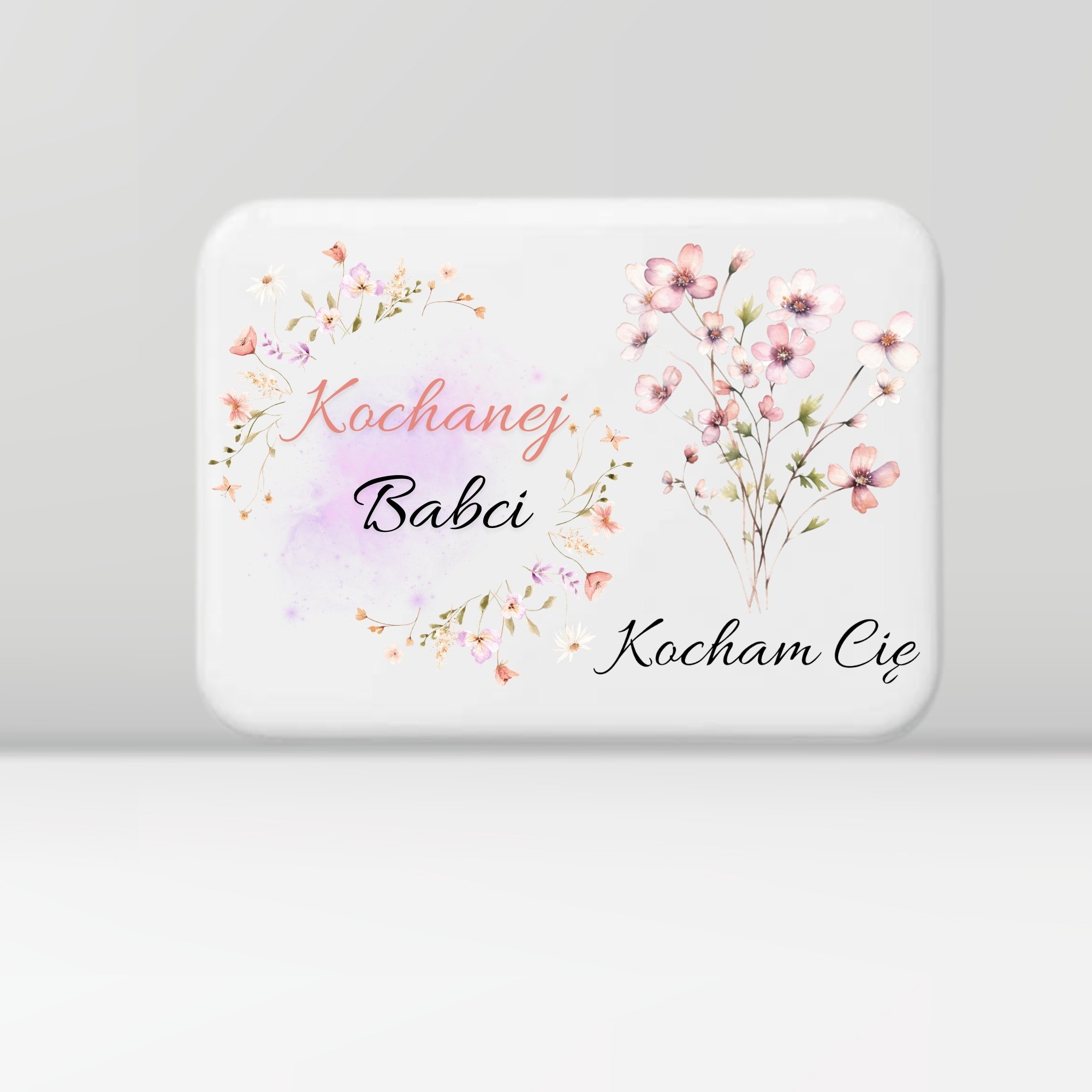 Ceramiczny magnes o wymiarach 5 × 7 cm, zaprojektowany jako subtelny i pełen emocji prezent dla Babci. Delikatna, pastelowa grafika kwiatowa w połączeniu z napisem „Kochanej Babci” oraz „Kocham Cię” tworzy elegancką i wzruszającą pamiątkę, która idealnie pasuje do każdego wnętrza.