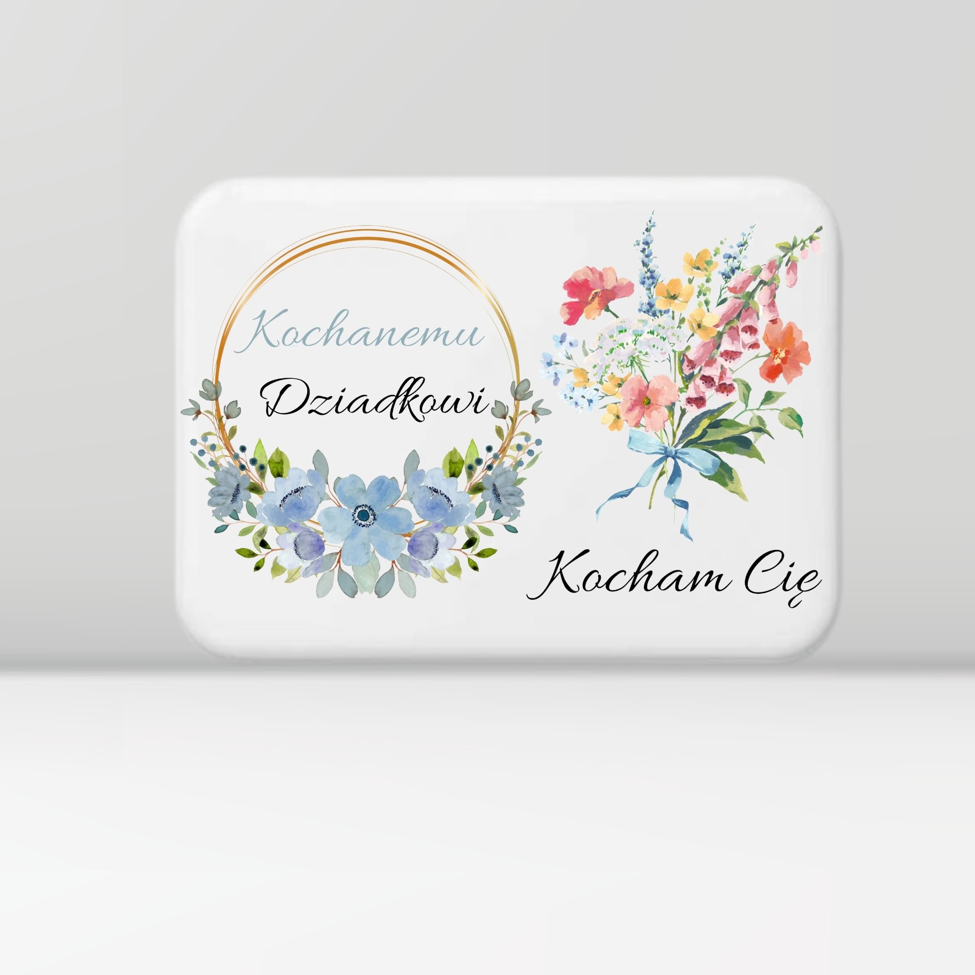 Personalizowany magnes ceramiczny o wymiarach 5 × 7 cm, stworzony z myślą o wyjątkowym prezencie dla Dziadka. Delikatna, kwiatowa grafika połączona z eleganckim napisem „Kochanemu Dziadkowi” oraz subtelnym „Kocham Cię” tworzy wzruszającą i ponadczasową pamiątkę.